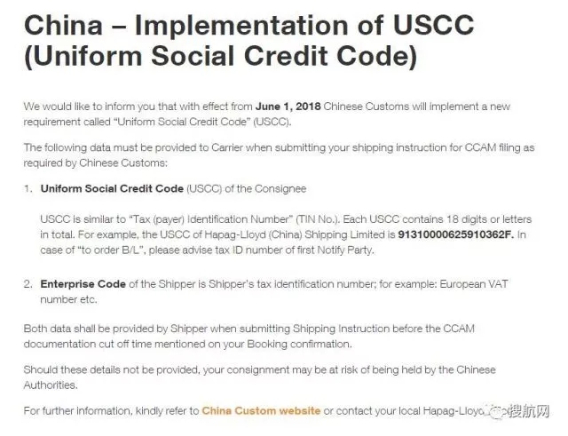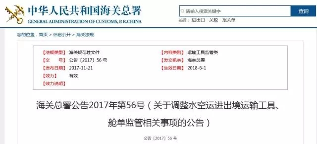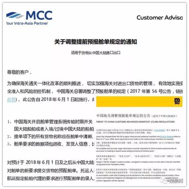這項被稱為2017第56號令的通知,全稱為 “關于調整水空運進出境運輸工具、艙單監管相關事項的公告”。 此公告是為確保全國通關一體化改革的順利推進,切實加強海關對水運和空運進出境運輸工具及其所載貨物、物品的管理,規范數據申報傳輸,保證數據完整準確,有效實施安全準入和風險防控機制,與出口行業息息相關,稍不留意將面臨貨物被扣的風險! 圖 | 海關總署公告截圖 新規與要求 1、中國海關開啟艙單管理系統傳輸時限開關,即完整、準確的艙單數據必須在裝船(駛離中國大陸船舶或者入境/過境中國大陸的船舶) 前24小時通過電子數據發送給中國海關; 托運人在向出口地海關申報貨物之前,應按照船公司指定船舶代理的要求進行預配艙單的錄人。 為此,馬士基、Hapag-Lloyd、MSC、MCC等眾多船公司已發布緊急通知: 此次調整意味著什么?將帶來哪些變化?讓我們來看看船公司Safmarine的官方解答: 問題一:2018 年 6 月 1 日起施行意味著什么? 解答一:對進口至中國大陸或經中國大陸港口中轉的貨物而言,如裝載船舶的預計離港日期為2018年6月1日及之后,貨物的完整、準確的艙單數據必須在裝船前24 小時前通過電子數據發送給中國海關。 問題二:完整、準確的艙單數據意味著什么? 解答二:提單項下的所有貨物名稱應在艙單中清晰、完整地逐一申報,新艙單調整的數據項包括: 發貨人代碼 (為必填項) 發貨人的電話號碼(為必填項) 發貨人的AEO 企業編碼(為選填項) 收貨人名稱(為必填項,請填寫實際收貨人名稱;如果收貨人為憑指令確定收貨人即TO ORDER,這里必須填寫“TO ORDER”) 收貨人代碼(僅在有實際收貨人時填寫;當收貨人為TO ORDER,這里無需填寫信息。) 收貨人的電話號碼(僅在有實際收貨人時填寫;當收貨人為TO ORDER,這里無需填寫信息。) 收貨人的具體聯絡人姓名(僅在有實際收貨人時填寫;當收貨人為TO ORDER,這里無需填寫信息。) 收貨人的具體聯絡人電話(僅在有實際收貨人時填寫;當收貨人為TO ORDER,這里無需填寫信息。) 收貨人的 AEO 企業編碼(選填項,有實際收貨人時可填寫) 通知方的代碼 ( 當收貨人為 TO ORDER,此項為必填) 通知方的電話號碼 ( 當收貨人為 TO ORDER,此項為必填) 問題三:請問對于艙單申報中違規的行為有處罰嗎? 解答三:對于艙單申報中違規的行為,海關已經制定了處罰條例。條例名稱:《中華人民共和國海關行政處罰實施條例》,此條例于 2004 年發布并生效。 問題四:請問調整后艙單申報的流程是否會導致客戶的商業敏感信息被公開? 解答四:新艙單調整的流程不會導致客戶的商業敏感信息被公開。承運人簽發的提單并不會顯示這些新增至艙單的敏感數據項 (收貨人名稱除外);艙單發送至海關后,海關工作人員依法須保護商業秘密和海關工作秘密。 問題五:請問艙單過了截止時間后可以修改嗎? 解答五:對于截止日期之后發送的艙單修改申請,目前流程待定。我們會在接下來的客戶通知中告知客戶。 問題六:請問對進口到中國大陸/經中國大陸港口中轉的貨物,客戶必須遵守“船運指示”的截止日期嗎? 解答六:是的。 問題七:請問對進口到中國大陸/經中國大陸港口中轉的貨物,客戶會被提醒應按時提交“船運指示”嗎? 解答七:是的。對進口到中國大陸/經中國大陸港口中轉的貨物,如客戶沒有按時發送“船運指示“,我們會在船到前 5 天,4 天、3 天通過電子郵件的方式分別提醒客戶提交“船運指示”。 問題八:請問如客戶提交的“船運指示”中缺失一個或數個必填信息怎么辦? 解答八:假如缺失必填信息,“船運指示”將不予接收,同時客戶會收到郵件通知要求提交完整的“船運指示” 。 問題九:請問針對艙單規定調整后增加的數據項,客戶如何將數據信息提交給薩非航運? 解答九:您可以通過自己熟悉的電子渠道在提交“船運指示”時提交這些新增信息息。“My.Safmarine.com”網站正在做相應的調整以符合新艙單規定的要求,調整后客戶可以直接在網站上提交信息;使用 INTTRA 和EDI 的客戶請將增加的數據項填寫在 COMMENT 框內發送。 問題十:請問船公司是否校對客戶“船運指示”中提交的收、發貨人代碼? 解答十:船公司不對收、發貨人代碼進行校對。發貨人或訂艙代理有責任在“船運指示”中提交準確的收、發貨人代碼。中國海關發布了《企業代碼類型匯總表》供企業參考,可根據表中國家或地區的索引完成企業代碼申報。 問題十一:請問如果收、發貨人是自然人而不是公司,是否可以接受無企業代碼? 解答十一:一般情況下,我們提單不接受收、發貨方為自然人。在提單允許的前提下,如收、發貨人是自然人, 客戶在企業代碼處應填寫客戶的中國身份證號或者護照號。 問題十二:請問如收、發貨人國家或地區不在《企業代碼類型匯總表》中,客戶如何提供企業代碼? 解答十二:如收、發貨人所屬國家或地區未列在《企業代碼類型匯總表》或者無法提供表中所列企業代碼類型時,應當填寫所在國家或地區的法定企業注冊代碼。